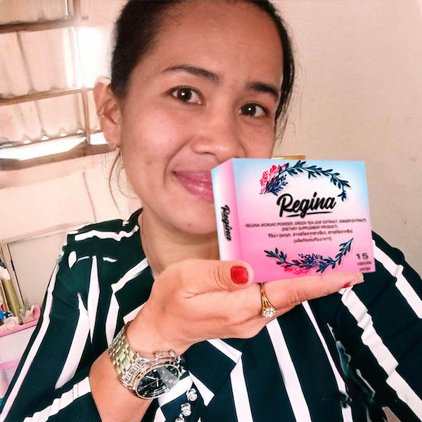 ฉันทาน Regina แค่สองอาทิตย์ มีความสุขมากเลยค่ะ น้ำหนักหายวับไปกับตาเลยค่ะ นอกจากนี้ฉันยังไม่ค่อยอยากทานอะไรเลยอีกด้วย
